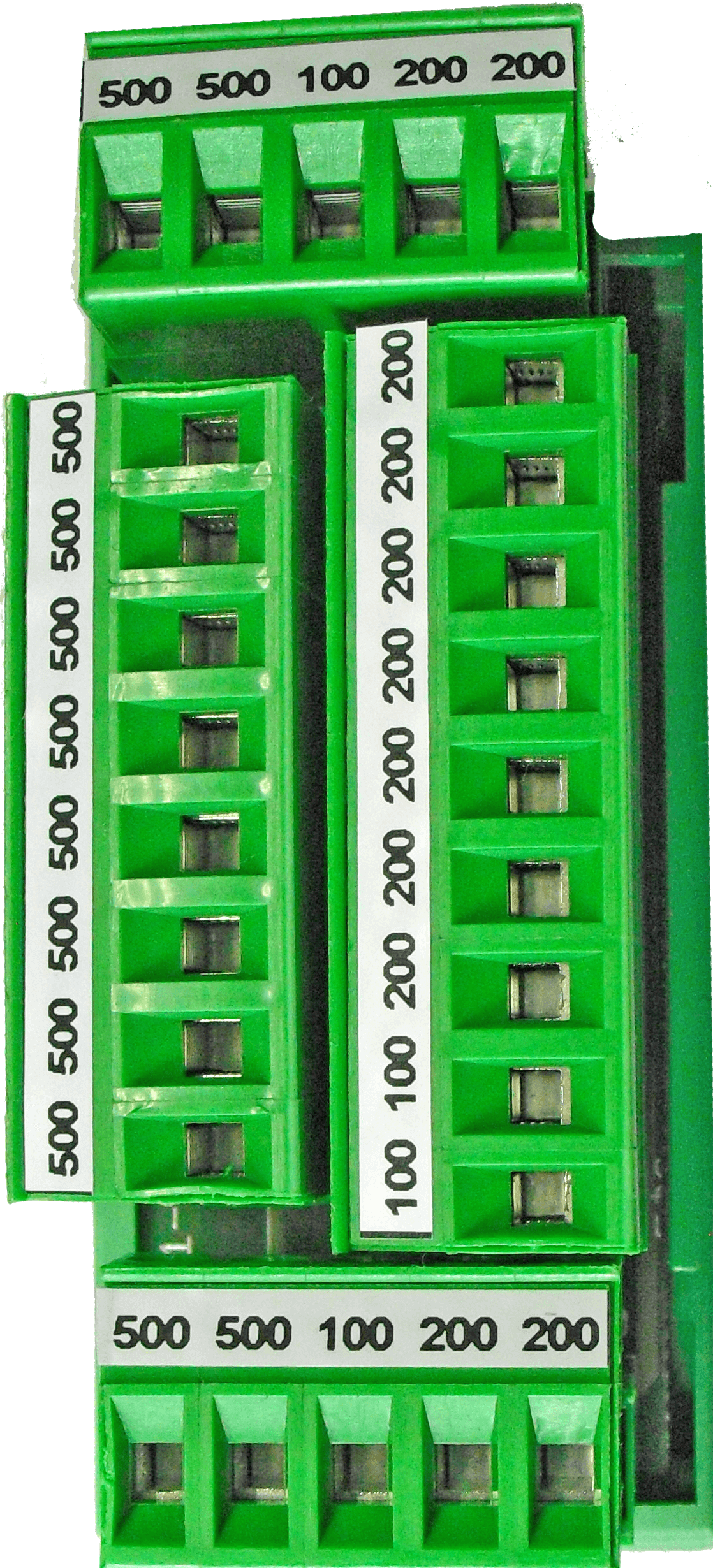 | Verwendung-Funktion: | Die neue Baugruppe X1-XK ermöglicht die Verteilung der Potentiale +24V ( 200 ), +12V ( 100 ) und 0V ( 500 ) über jeweils 17 Klemmen. Einsatzraum ist die Steuerung. |